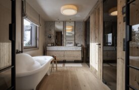 Eine gemütliche Wohlfühloase für die ganze Familie und Freunde stand im Mittelpunkt – ein Ort, an den man nach einem erlebnisreichen Tag auf der Skipiste gerne zurückkehrt. Das Designkonzept verbindet traditionellen alpinen Charakter mit einer zeitlosen, modernen Formsprache. Alpine Materialien stehen dabei klar im Vordergrund: Altholz als prägendes Leitelement, kombiniert mit feinen Spachteltechniken, Naturstein aus Italien in der Küche, hochwertigen Stoffen, Bronze-Glas sowie edlem Feinsteinzeug.