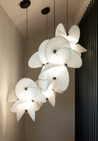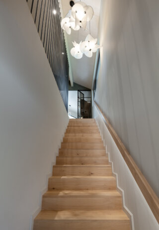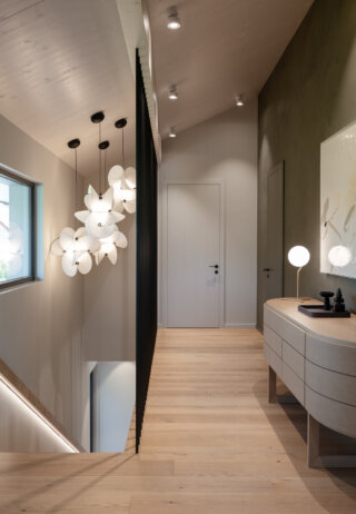 Über dem Treppenaufgang entfaltet die filigrane Pendelleuchte ihre skulpturale Präsenz – sie zieht den Blick in den offenen Luftraum und verbindet das Erdgeschoss mit der oberen Ebene.