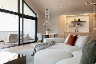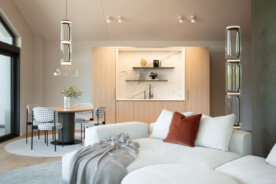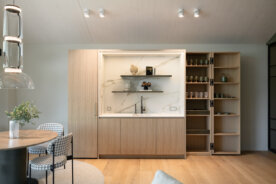 Die Küche fügt sich als reduziertes Barelement harmonisch in den Wohnraum ein. Dank einer durchdachten Schranklösung lässt sich der gesamte Küchenbereich bei Bedarf vollständig öffnen – oder mit nur einem Handgriff schließen, sodass die Schränke verdeckt sind und eine ruhige, wohnliche Atmosphäre entsteht.