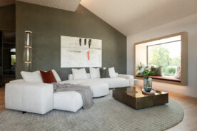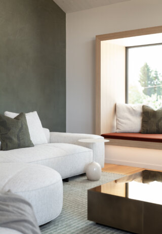 Die großzügige Sitznische am Fenster bildet ein zentrales Gestaltungselement – ein Ort der Ruhe, der den Blick ungehindert in die Landschaft lenkt. Offen zur Natur und zur angrenzenden Terrasse verschmilzt sie mit dem Außenraum und erweitert den Wohnbereich ins Grüne.