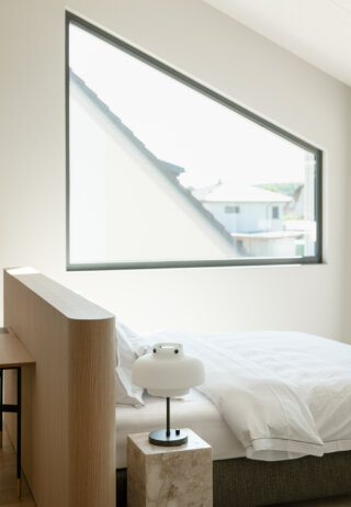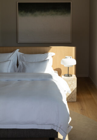 Das Master-Schlafzimmer präsentiert sich in reduziertem Design – geprägt von hellem Holz, klaren Linien und einer luftigen Raumwirkung. Maßangefertigtes Mobiliar fügt sich nahtlos in die Architektur ein und unterstreicht die ruhige, harmonische Atmosphäre des Raumes.