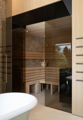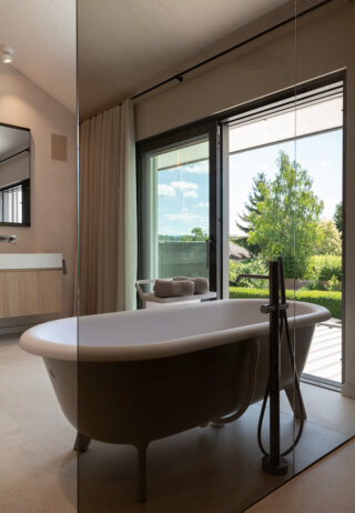 Im Dachgeschoss entstanden großzügige Räume, die den Blick bewusst nach außen richten und die Verbindung zur Natur in den Mittelpunkt stellen. Große Fensterflächen öffnen das Geschoss, lassen Licht und Weite einfließen und schaffen eine Atmosphäre, die gleichermaßen klar wie behaglich wirkt.