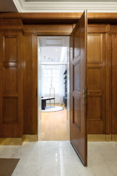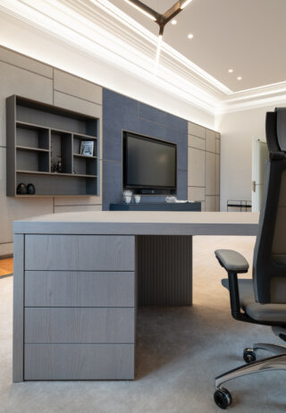 Hohe Räume, fein gearbeitete Stuckdecken, Parkettböden und Kastenfenster sowie die rötlich-braune Holzvertäfelung im Vorraum prägen den Charakter des denkmalgeschützten Gebäudes. In diesem Kontext entstand eine eigenständige, zeitlose Arbeitsumgebung mit klarer gestalterischer Haltung.