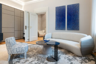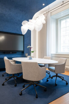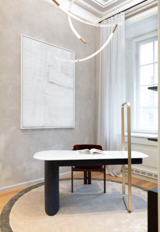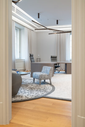 Die hohen Räume verlangten nach einer präzisen Strukturierung, die über Materialität, Farbe und Textur definiert wurde. Ein dunkelblaues Paneel zoniert den Besprechungsbereich, während ein runder Teppich den Loungebereich vom Arbeitsplatz trennt. Der niederflorige Teppich wurde bewusst gewählt, um Funktionalität im Büroalltag zu gewährleisten und gleichzeitig eine wohnliche Atmosphäre zu schaffen. Die Akzentfarbe Blau zieht sich als verbindendes Element durch den Raum – am Boden, partiell an der Wand und in der Deckeninszenierung. In Kombination mit warmen, neutralen Tönen, dunklen Messingdetails, Leder und gebeizter Eiche entsteht ein ausgewogenes Zusammenspiel aus Eleganz und Zurückhaltung.