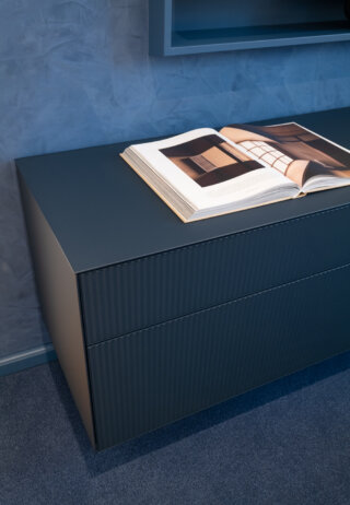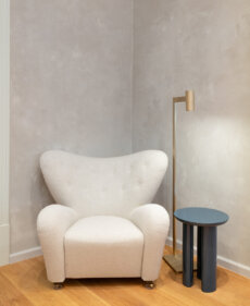 An den Wänden verleiht eine feine Spachteltechnik dem Raum Tiefe und eine lebendige Oberfläche, die durch das gezielt eingesetzte Licht zusätzlich betont wird. Eine zurückhaltend gestaltete Teeküche ergänzt den Raum funktional und fügt sich selbstverständlich in das Gesamtkonzept ein.