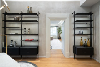 Der umgestaltete Bereich gliedert sich in vier Räume: einen Vorraum, eine als „Bibliothek“ konzipierte Empfangs- und Wartezone, einen Besprechungsraum mit integrierter Teeküche sowie das Büro. Die Bibliothek bildet den repräsentativen Auftakt der Raumabfolge. Als Empfangs- und Wartebereich gestaltet, erinnert sie atmosphärisch eher an einen privaten Salon als an eine klassische Office-Situation. Von hier aus erschließen sich die weiteren Räume, die funktional klar definiert und gestalterisch miteinander verknüpft sind.