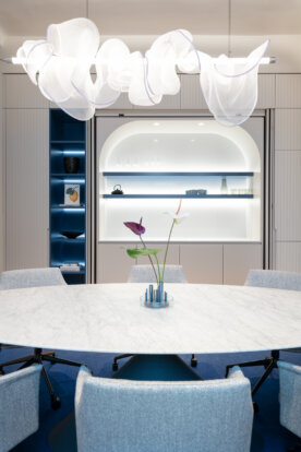 Indirekte Lichtvouten sorgen insgesamt für eine ruhige, harmonische Ausleuchtung und betonen die architektonischen Qualitäten des Bestands. So entstand ein repräsentativer Arbeitsort, der Seriosität und Wohnlichkeit vereint.